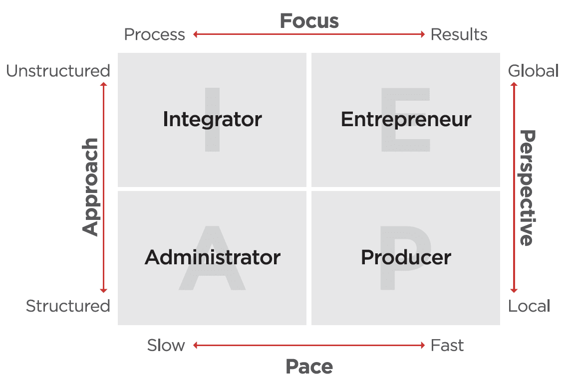 The corporate world’s version of APEST is what Adizes calls the PAEI model. Try to spot the similarities here.