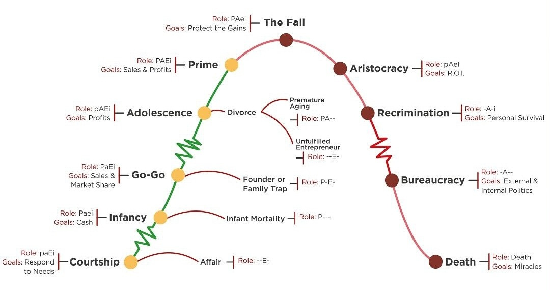 A quick word on how to read this image which is directly from the Adizes Institute. Each stage describes the target “Goal”, and the ideal deployment of the “Roles” by giving each of the PAEI functions a dash for non-existence, a lower case letter for present but low priority, or upper case letter for high priority.